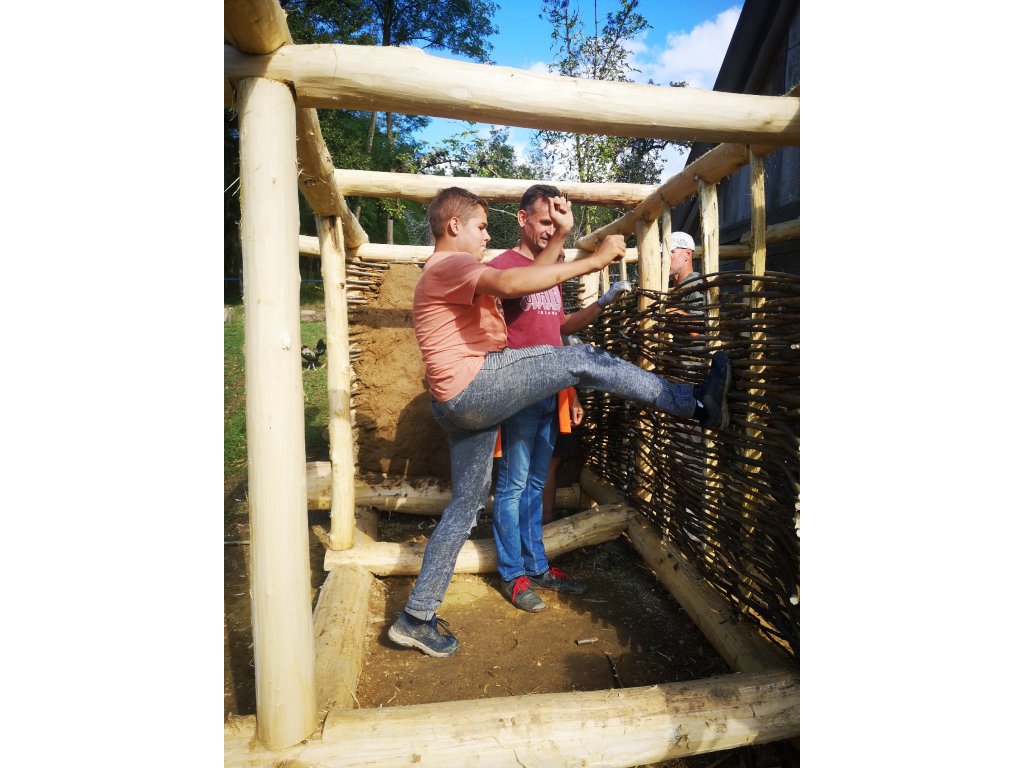 Az elméleti áttekintés után a Szentendrei-szigeten elérhető anyagokból gömbölyű fa ácsolásban jártas ácsok közreműködésével a meglévő kenyérsütő épületre kialakítjuk a karóvázat, a nyílászáróknak helyet készítünk, és ezt sövényfonással befonjuk. Majd ezt a sövényfonatot törekes vályoggal betapasztjuk.